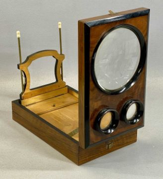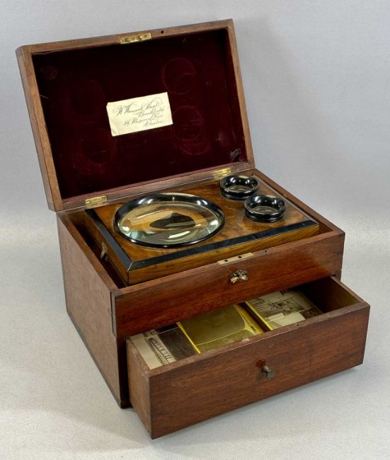 VICTORIAN BOXED THREE LENS STEREOSCOPIC VIEWER, c. 1890, walnut and ebonised in a contemporary velvet lined base, lower drawer containing a variety of original viewing cardsProvenance: private collection Denbighshire
