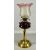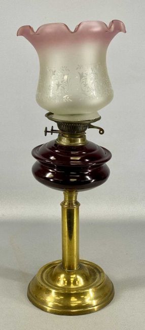 TWO 19TH CENTURY OIL LAMPS, first having brass column, black ceramic reservoir, twin burners, and etched pink and clear glass shade; second having pierced painted cast-iron base, red glass reservoir, and single burner (2)Provenance: private collection Ynys Môn