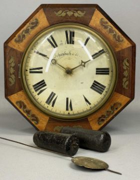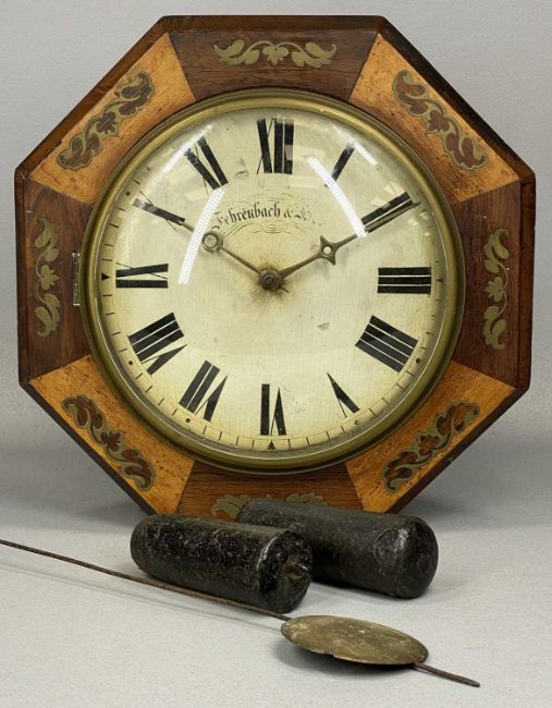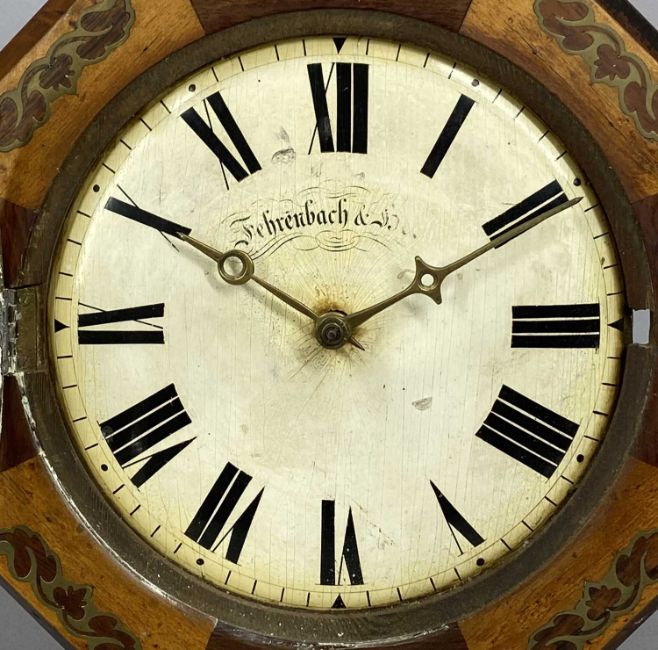 BLACK FOREST TYPE POSTMAN'S WALL CLOCK, octagonal dial surround with brass inlay, convex glass, dial signed 'Fehrenbach', twin weights, 32 (h) x 32 (w) x 23cms (d)Provenance: private collection Conwy