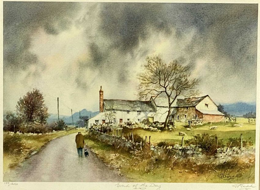 WELSH & OTHER ARTISTS: KEITH ANDREW (b. 1947) two limited edition prints - 'Puffin Island' (34/550), and 'Porth Cwyfan' (29/550), 20 x 28cms; GERALD V. GADD (d. 2011) limited edition (109/450) print - 'End of the Day', 29.5 x 39.5cms; and two books by SIR KYFFIN WILLIAMS, 'A Wider Sky' and 'Across the Straits'