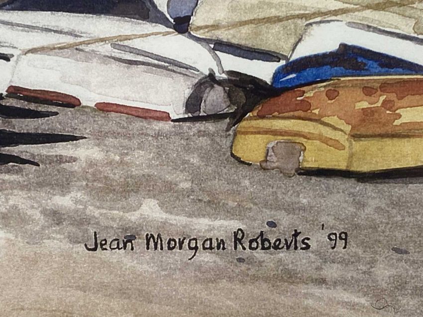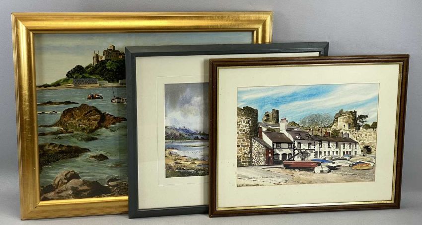 ASSORTED ARTISTS: BYRON REED pastel - figures boarding boats for St Michael's Mount, signed and dated 1978 lower right, 45 x 58cms; CHRISTINE SCOTT watercolour - entitled verso 'Early Morning, Conwy Estuary', 26 x 35cms; and JEAN MORGAN ROBERTS watercolour - entitled 'Smallest House and Fishermen Cottages, Conwy', signed and dated '99 lower right, 28 x 39cms, (3)Comments: framed and glazed
