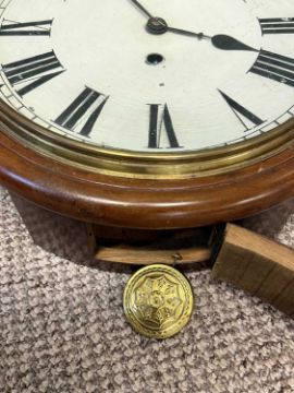 WALNUT DROP-DOWN PENDULUM WALL CLOCK, 75 (h) x 40cms (w); and a school type wall clock with painted dial (2)Provenance: deceased estate Denbighshire