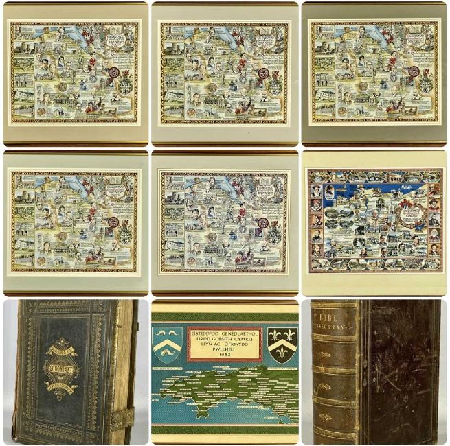 WELSH HISTORY: two old family bibles, one with brass clasps, five neatly framed Eisteddfod posters, and two othersProvenance: deceased estate Denbighshire