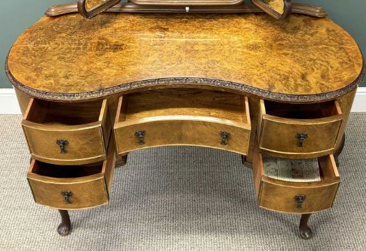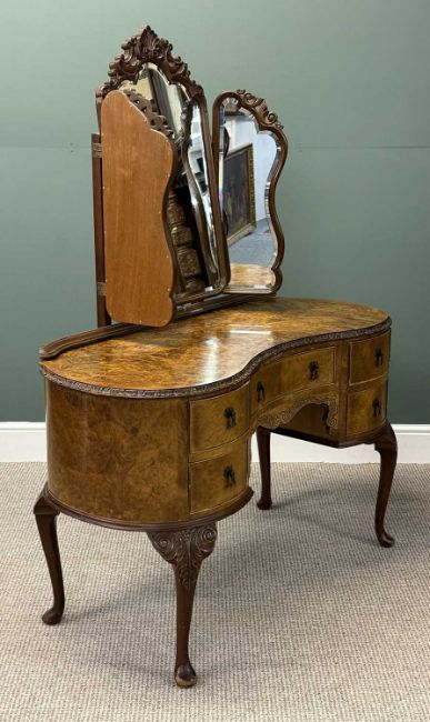 WALNUT VENEERED KIDNEY SHAPED DRESSING TABLE, with triple swing mirror back, carved cabriole frontal supports, 160 (h), 124 (w) x 55cms (d)Provenance: private collection Conwy