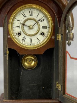 AMERICAN SHELF CLOCK, Newhaven, mahogany case, arched glazed door, 49 (h) x 18 (w) x 12.5cms (d)
