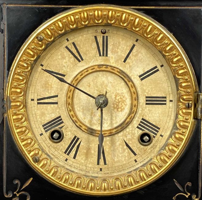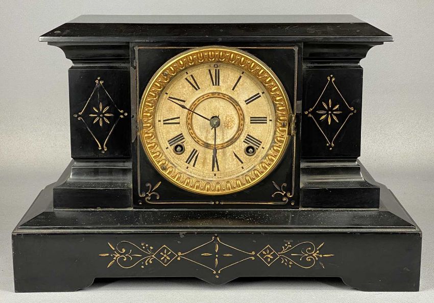 ANSONIA BLACK SLATE EFFECT STEEL MANTEL CLOCK, 8-day movement striking on a gong, 25 (h) x 39 (w) x 16cms (d)
