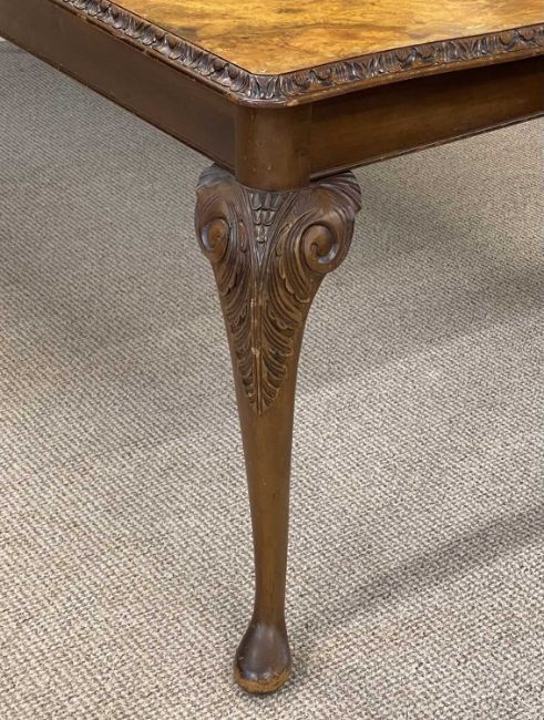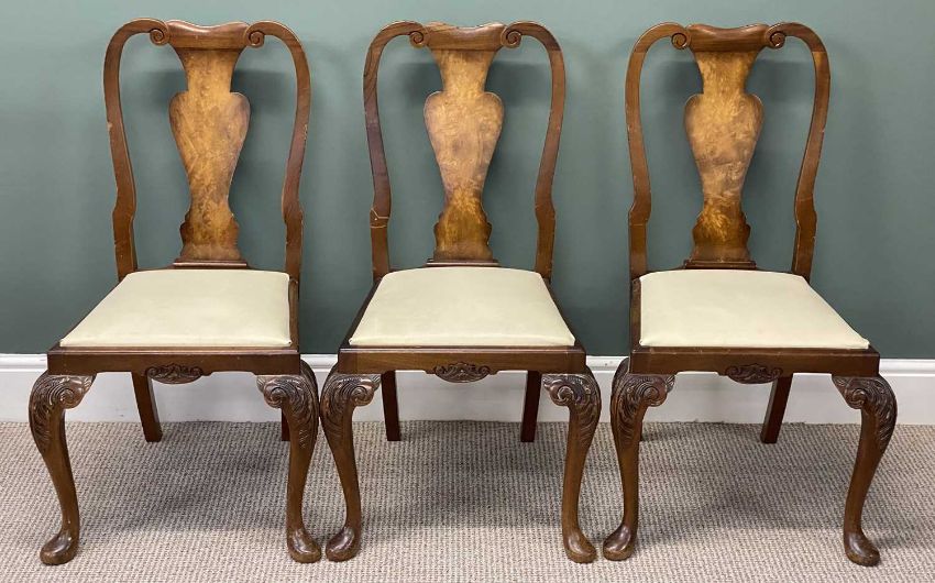 LARGE BURR WALNUT DINING TABLE, rectangular top with serpentine ends and carved rim, carved cabriole supports, 78 (h) x 244 (l) x 99cms (w); with eight Queen Anne style walnut dining chairs, solid vase shaped splat backs, drop-in upholstered seats, carved cabriole frontal supports (6+2), carvers 97 (h) x 56 (w) x 44cms (d), singles 95 (h) x 54 (w) x 42cms (d) (9)Provenance: private collection Conwy