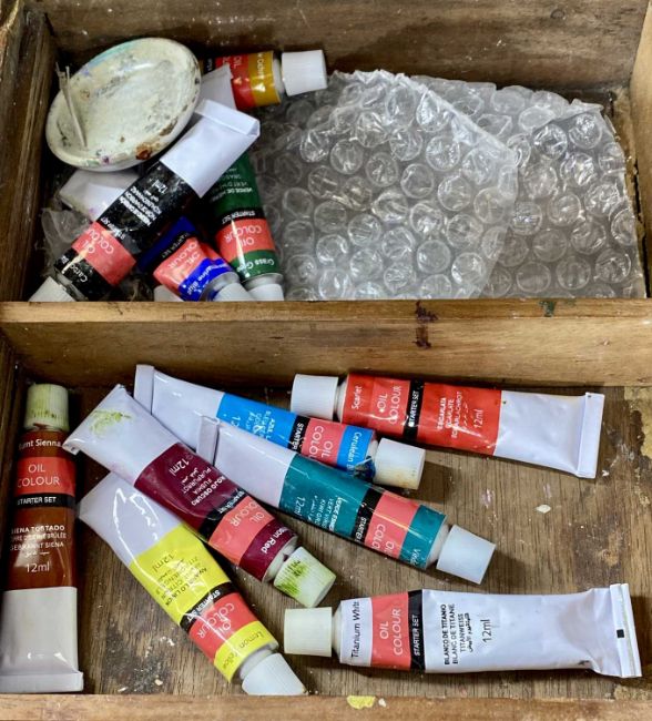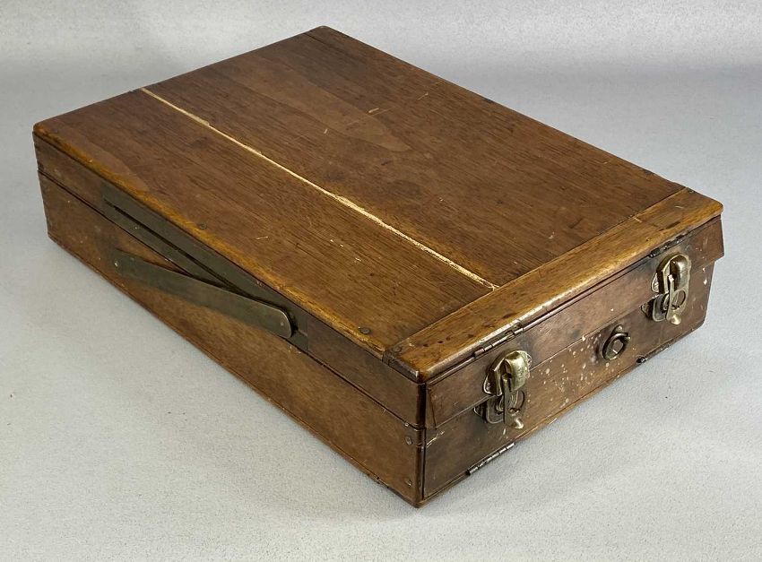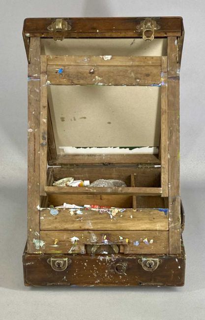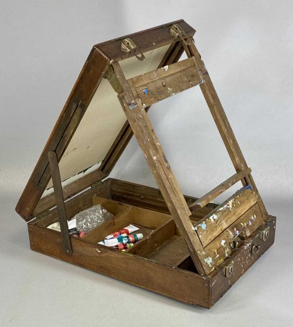 VINTAGE MAHOGANY ARTIST'S PORTABLE STUDIO EASEL, with compartment for paint, leather carrying handle, 10 (h) x 28 (w) x 41cms (d) (closed)Provenance: private collection Conwy