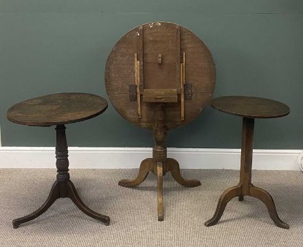 THREE 19TH CENTURY TRIPOD TABLES, mahogany circular tilt top, 78 (h) x 76cms (diam.); oak circular tilt top, 72 (h) x 61cms (diam.); and oak circular fixed top, 72 (h) x 48cms (diam.) (3)Provenance: private collection Conwy