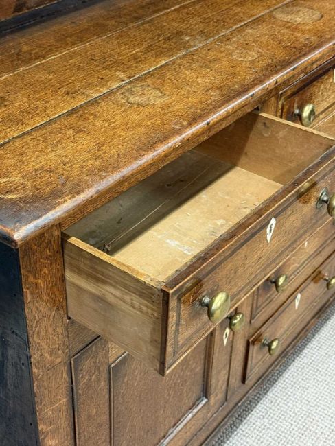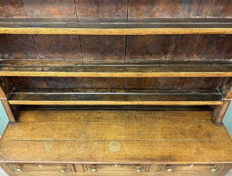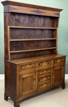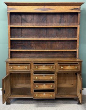 EARLY 19TH CENTURY OAK WELSH DRESSER, boarded plate rack back, four centre drawers, further drawer over cupboards to either side, brass knob handles, ivory escutcheons, 214 (h) x 158 (w) x 50cms (d)Provenance: private collection GwyneddGOV.UK Ivory content- to comply with current regulation - self-declaration form completed for the sale of this item - Submission reference K23DBZYZ