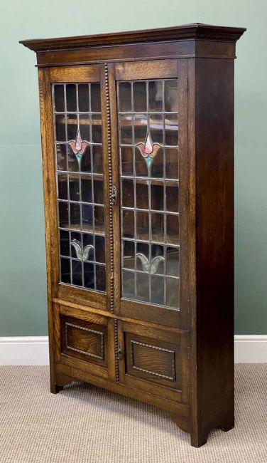 'ARTS & CRAFTS' BOOKCASE CUPBOARD having twin leaded and stained-glass doors, base cupboard doors and beadwork detail, 171 (h) x 104 (w) x 32cms (d)Provenance: deceased estate Denbighshire
