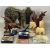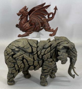 ASSORTED FIGURINES & ORNAMENTS, including an Edge resin sculpture of an elephant, 23cms (h); an Edge resin figure of a dragon, 20cms (h); bronze composite figure of gundog retrieving a hare, 15cms (h); composite Celtic cross wall plaque, 22cms (h); pair of onyx horse head bookends, 13cms (h); small terracotta Roman oil lamp, 9cms (h), etc.Provenance: deceased estate Conwy