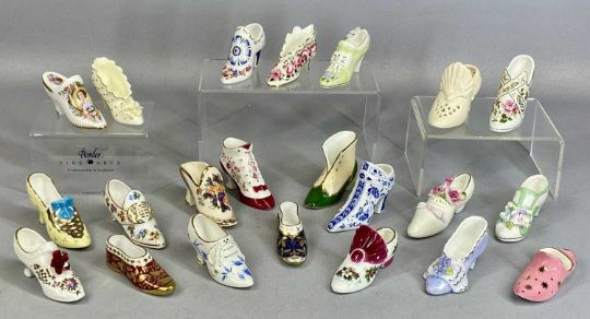 ORNAMENTAL CHINA SHOE COLLECTION (21) to include Spode, Worcester, Aynsley, etc., also, ornamental teapot collection (13), to include Meissen, Worcester etc.Provenance: private collection Gwynedd