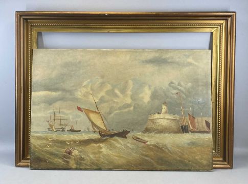 T. GARNON (c. 1850-1910) oil on canvas - seascape with boats and lighthouse to side, signed lower right, 61 x 91cmsAuctioneer's Note: Rev. Thomas Garnon was a Baptist minister in 19th-century South Wales. In later life he lived in Fishguard and gained some fame in retirement as a painter of local and maritime scenes.Provenance: private collection ConwyComments: framed