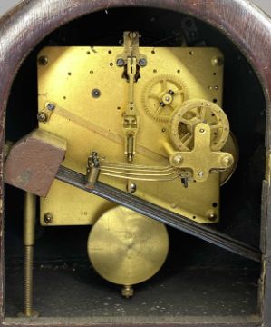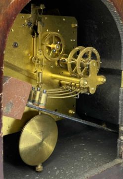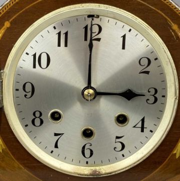 GERMAN MAHOGANY CASED 'NAPOLEON'S HAT' MANTEL CLOCK, inlaid case, silvered dial, 8-day chiming movement, 24 (h) x 43 (w) x 14cms (d)Provenance: private collection Conwy