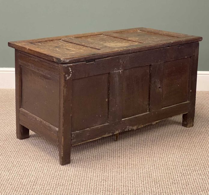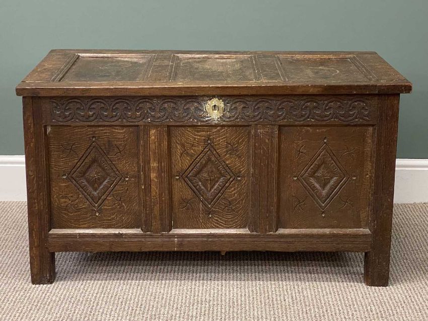 18TH CENTURY JOINED OAK COFFER, hinged triple panel lid, over carved triple panel front, 60 (h) x 105 (w) x 54cms (d)Provenance: private collection Conwy