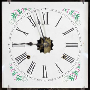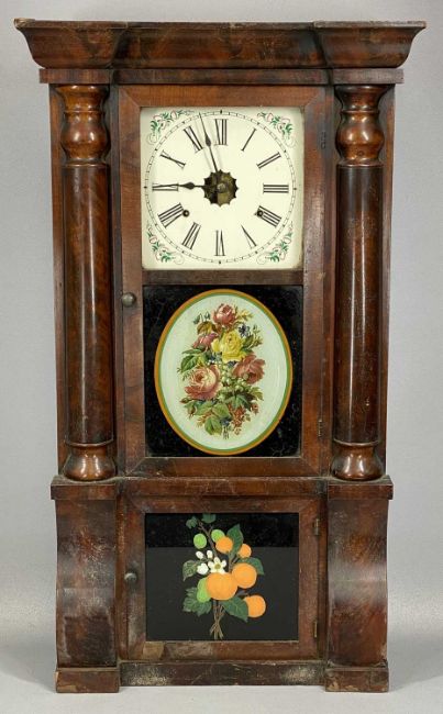 LATE 19TH CENTURY AMERICAN SHELF CLOCK, mahogany case, floral decorated glazed doors flanked by half-turned columns, 83 (h) x 46 (w) x 17cms (d)