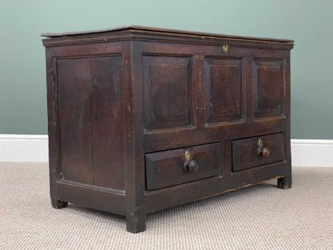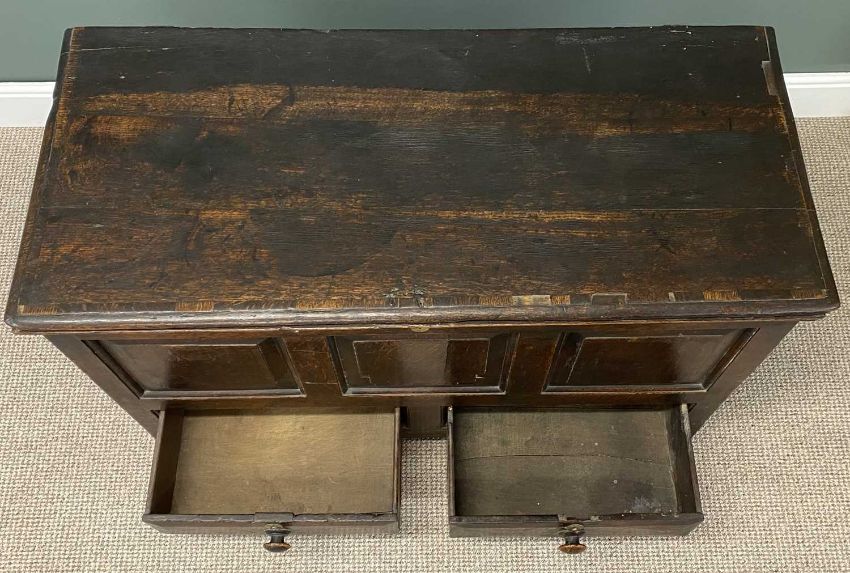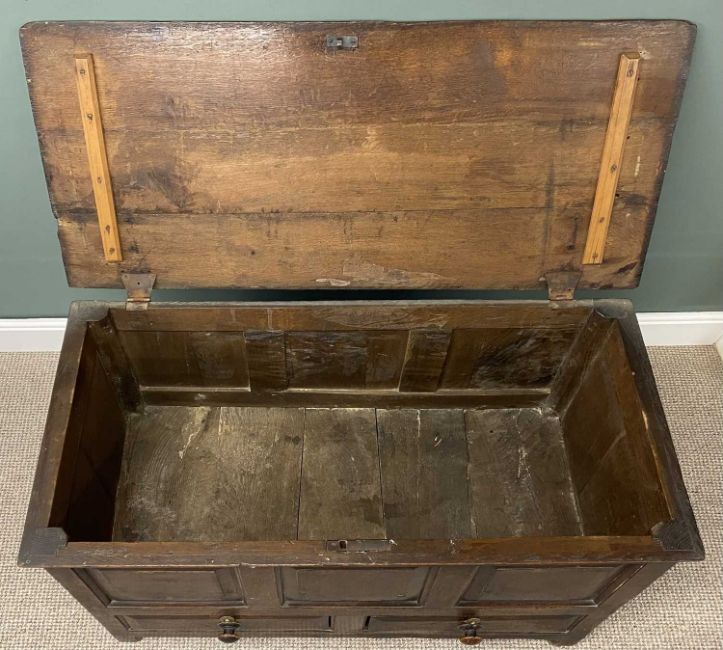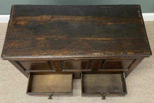 ANTIQUE JOINED OAK COFFER, cross banded hinged top over triple panel front and two drawers, turned knob handles, 76 (h) x 118 (w) x 64cms (d)Provenance: private collection Flintshire