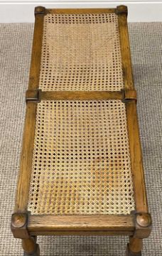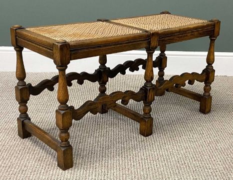 JACOBEAN STYLE OAK FRAMED TWO-SEATER STOOL, cane seats, turned supports, and shaped frontal stretcher, 47 (h) x 67 (w) x 35cms (d); and a mahogany centre table, shaped square top, slender shaped supports united to an under tier, 73 (h) x 61cms² (2)Provenance: private collection Conwy