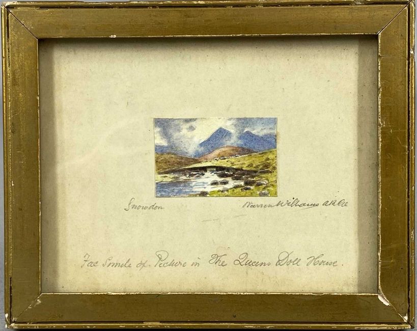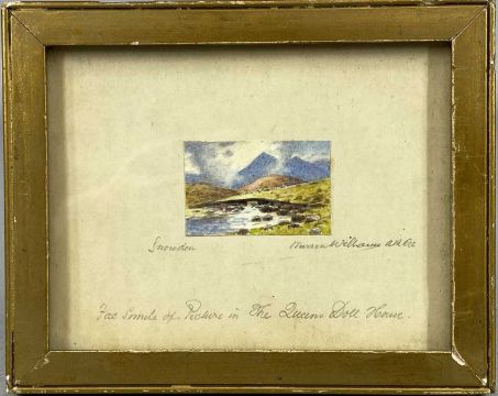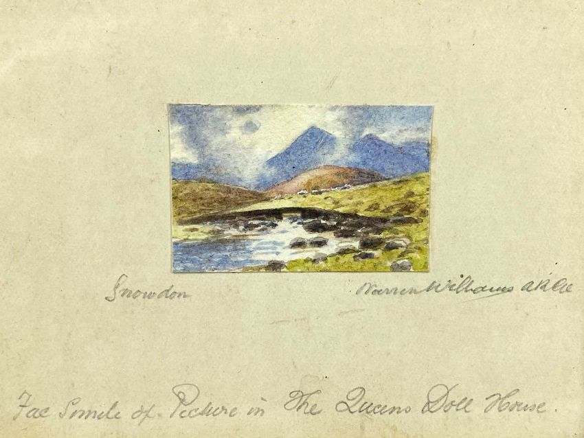 ‡ WARREN WILLIAMS (Welsh 1863-1941) miniature watercolour - entitled 'Snowdon', signed and entitled in pencil, inscribed 'Facsimile of Picture in The Queen's Doll's House', 2.5 x 4cmsProvenance: private collection ConwyComments: framed and glazed