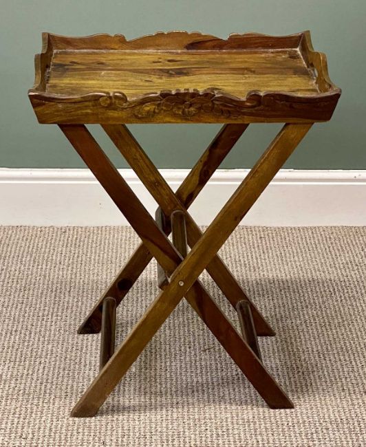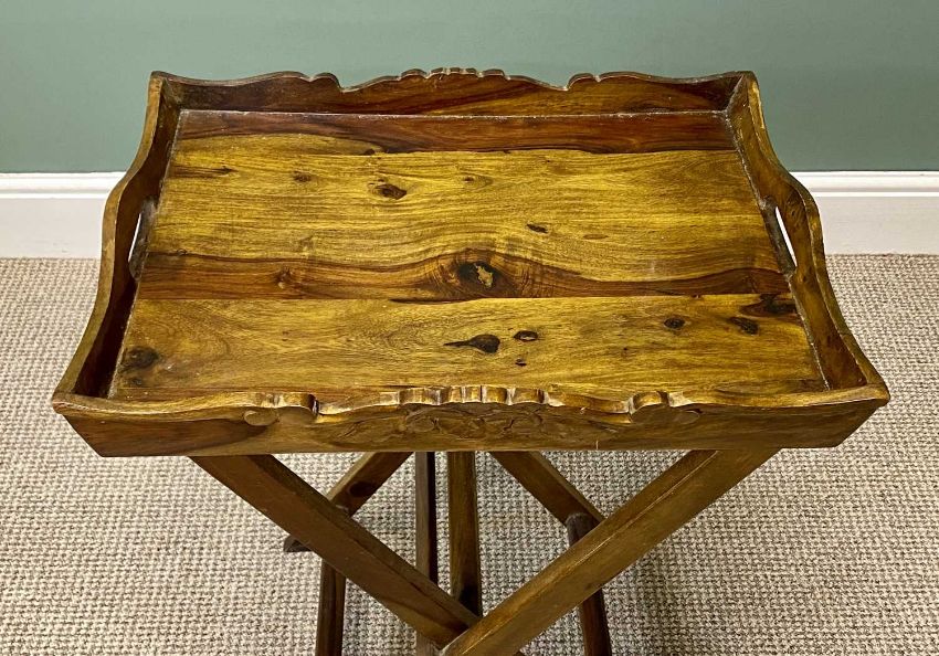 MID-CENTURY MYER TWO-TIER LOW COFFEE TABLE with smoked glass top, and a hardwood butler's tray with folding stand (2)Provenance: private collection Gwynedd