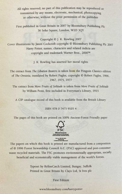 ROWLING (J. K.) 'Harry Potter and the Goblet of Fire', 'Harry Potter and the Order of the Phoenix', 'Harry Potter and the Deathly Hallows', Bloomsbury Books, hardback; and 'Harry Potter and the Half-Blood Prince', softback