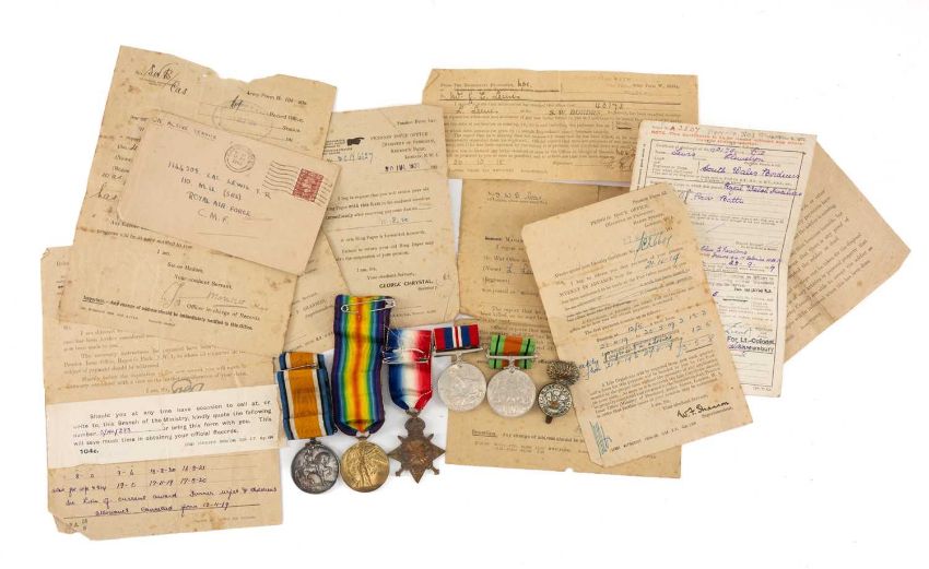 MILITARY CLUB HOUSE: GREAT WAR MEDAL GROUP OF THREE, named to 20557 Pte. H. Owens, Royal Welch Fusiliers, comprising Mons Star, War Medal, and Victory Medal, with ribbons and cap badge, associated paperwork named to 40175 Pte. Lewis Llewelyn, South Wales Borderers, including discharge certificate and missing notification dated 18.09.18 in Salonica, and two WWII medalsAuctioneer's Note: The Salonica Campaign took place in northern Greece, Serbia, and Albania from 1915-18, and saw action from Welsh units including the Royal Welsh Fusiliers.Provenance: private collection Gwynedd.