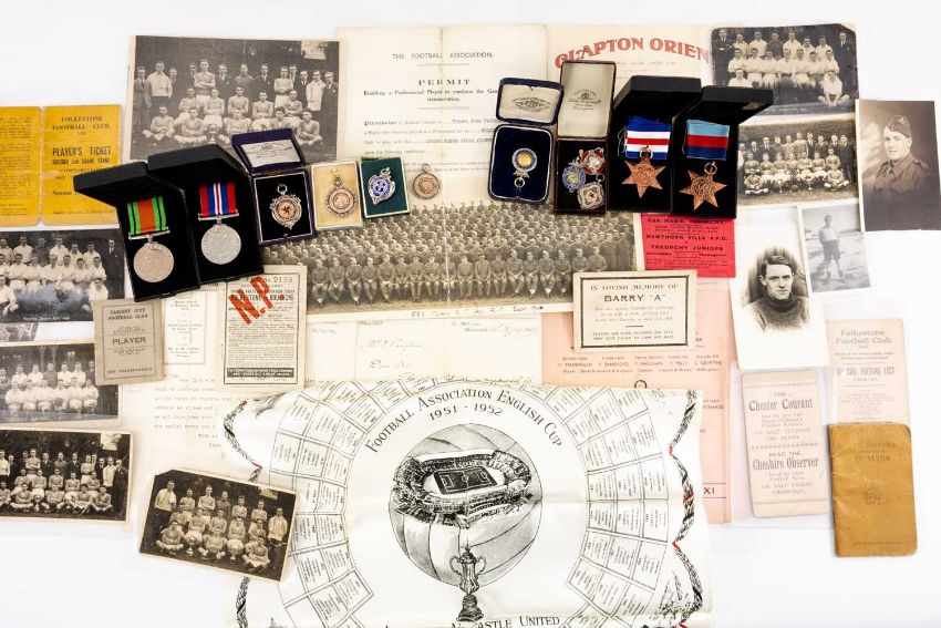 FOOTBALL CLUB HOUSE: EPHEMERA & MEDALS RELATING TO WELSH PRO THOMAS (TOMMY) JOHN VAUGHAN, 1920s/1930s. Ephemera includes team photo-postcards (e.g. Treorchy), Cardiff City FC 'Player's Ticket', match ticket for Treorchy Juniors, printed team-sheet programme for Jim Murphy's XI v Treorchy Juniors XI, 1934 handwritten enquiry for the services of Tommy for the inside left position on headed paper from Macclesfield Football Club, typed letter from Clapton Orient (latterly Leyton Orient) informing Tommy of his selection for a two month trial period, a printed letter from Treorchy Club regarding 'old age pension', a printed silk commemorative handkerchief for the 1942 FA Cup (Arsenal v Newcastle Utd), a printed letter from the FA permitting Tommy to pursue football at amateur level, 1936 Folkestone FC 'player's ticket'. Football medals (mainly silver and enamel) include Upper Rhondda Association Football League (2x), South Wales & Mon. FA, Cennamo Cup 1920, Ton Pentre Schools. Also, Tommy Vaughan's WWII medals comprising 1939-45 Star, Defence Medal, France & Germany Star, 1939-45 Campaign Medal (later issued in 2009). Tommy Vaughan played at a number of clubs at professional level including 14 games for Cardiff City in 1934-35, scoring four goals.Provenance: private collection Rhondda Cynon Taff