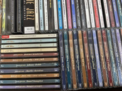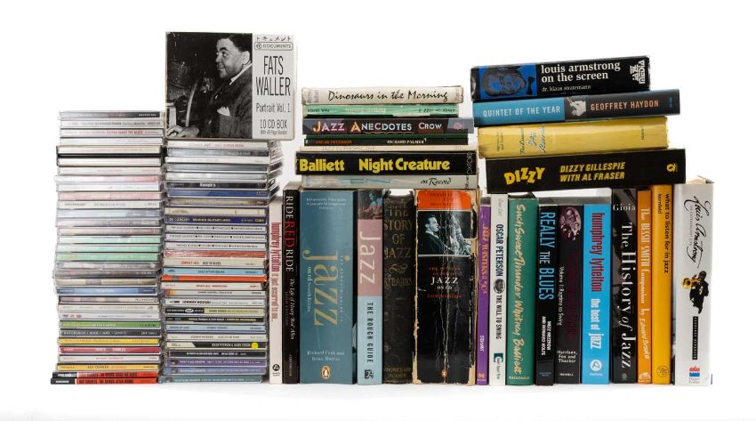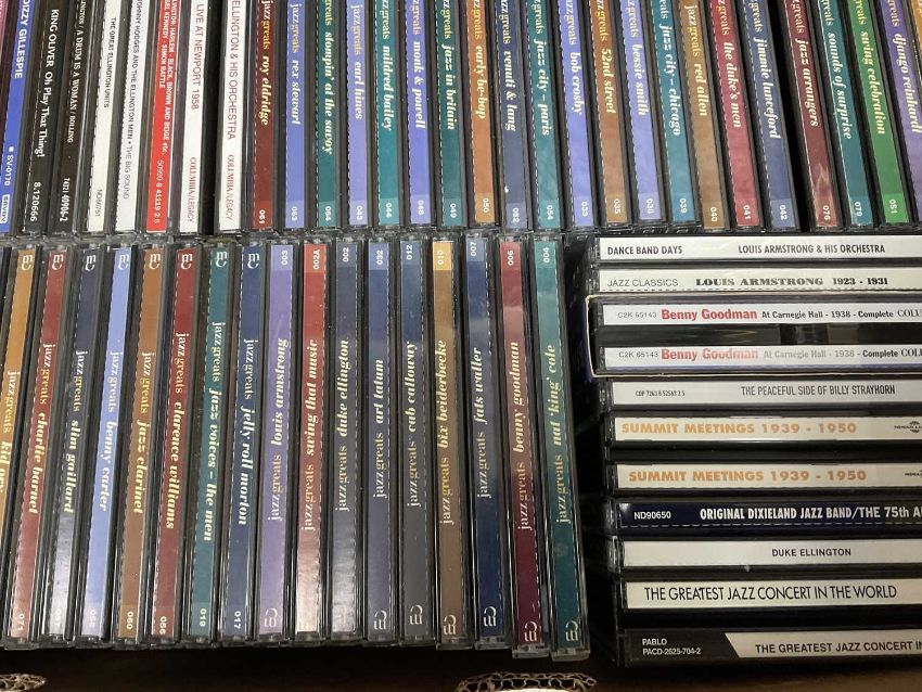 MUSIC CLUB HOUSE: LARGE COLLECTION OF JAZZ, SWING & BLUES CD'S, mainly early years and mixed genres including Trad., New Orleans, Dixieland, Harlem Stride, Blues, Swing, Big Band etc from artists including (but not exclusively): Fats Waller, Sidney Bechet, Fats Domino, Bix Beiderbecke, Art Tatum, Oscar Peterson, Ella Fitzgerald, Rex Stewart, Louis Armstrong, Duke Ellington, Johnny Hodges etc, approx. over 250 CD's, together with a large collection of Jazz themed literature inc. books and several copies of Jazz Monthly, Jazz Journals etc. (qty.)Provenance: private collection AngleseyComments: The CD's appear to be complete however given the size of the collection we cannot guarantee each case has the correct CD, neither can we offer a complete listing of recordings or condition report, inspection advised