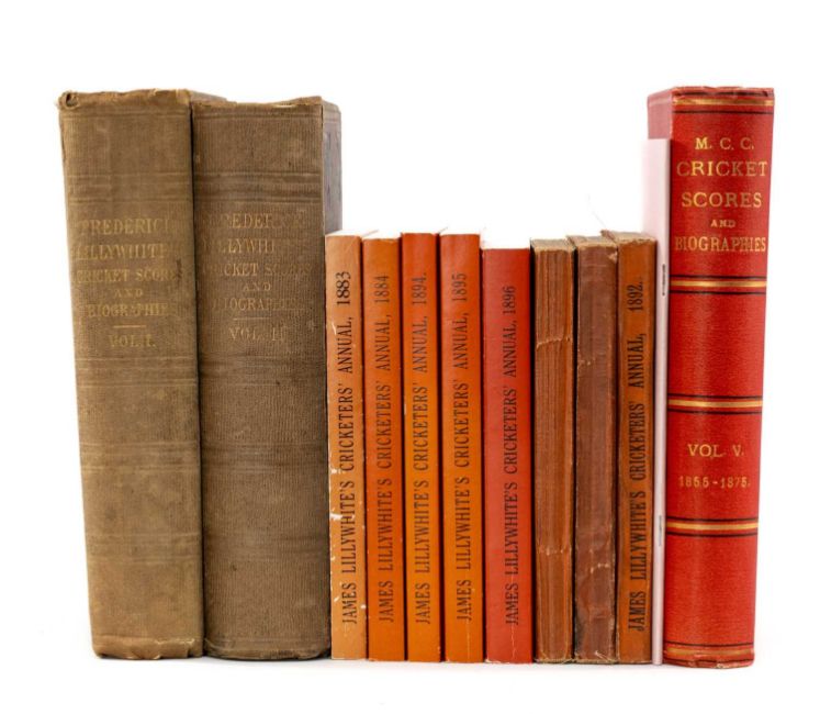 CRICKET CLUB HOUSE: SELECTION OF JAMES LILLYWHITE'S CARICATURES & ANNUAL, dates 1885, '87 and '92, with facsimile copies of 1883, '84, '94, '95 and '96, together with Frederick Lillywhite's 'Cricket Scores & Biographies of Celebrated Cricketers', volumes 1 (1746-1826) & 2 (1827-1840), 'The Oval Kennington, Surrey 1862' published by Frederick Lillywhite with purple cloth covered board, along with Arthur Haygarth's 'Cricket Scores & Biographies' from 1855-1875 (a continuation of Frederick Lillywhite's 'Scores & Biographies' from 1772-1854), published at the cost of Marrowbone Club, printed by Longman's & Co, London, 1876Provenance: private collection AngleseyComments: see photographs, generally very good