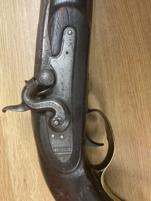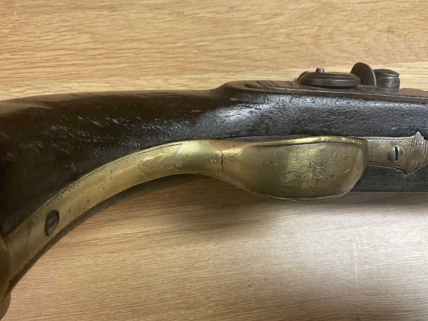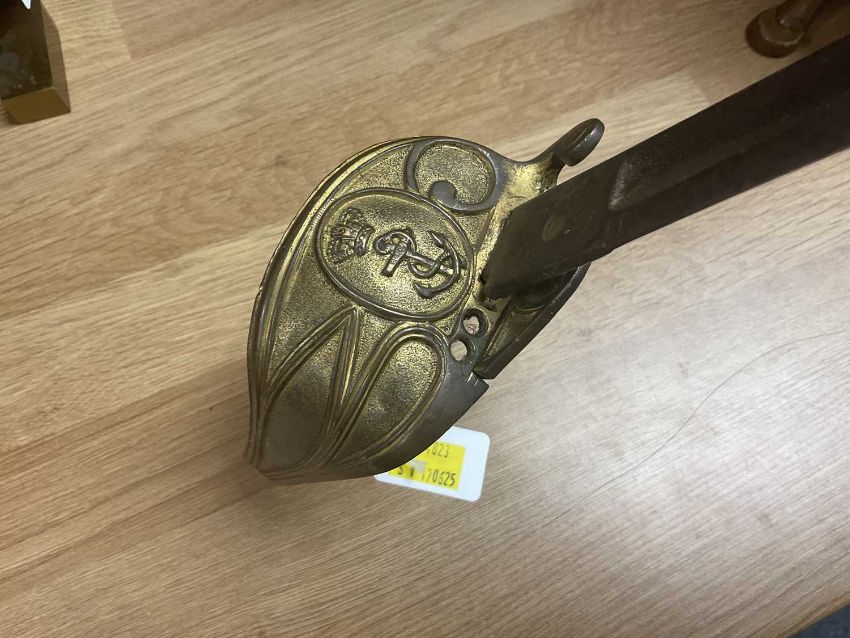 MILITARY CLUB HOUSE: PISTOL, SWORD & CANE, the percussion cap pistol converted from a flintlock musket (alterations to trigger guard and butt cap etc.), 53.5cms long; naval P.1846 Naval Officer's sword with etched blade (rubbed, corroded, damaged hilt), overall 82.5cms, and silver mounted cane 89.5cms (3)Provenance: private collection GwyneddComment: all with condition issues.