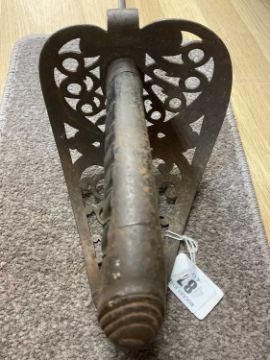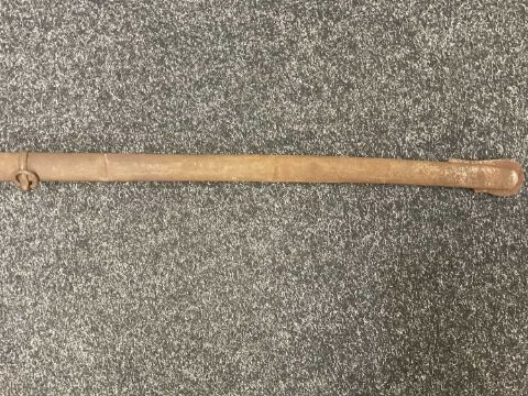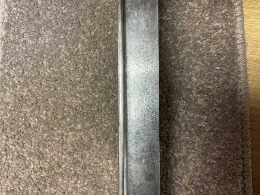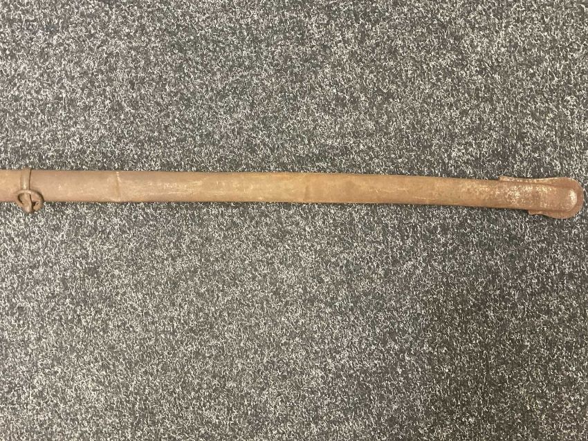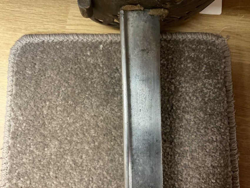 MILITARY CLUB HOUSE: WILLIAM IV P.1821 HEAVY CAVALRY OFFICER'S SWORD, Moore & Co. (Bond Street) pipe-back blade, etched blade with scrolling pierced guard around a wire-bound leather grip, stepped pommel, metal scabbard.Provenance: private collection Ynys MônComments: blade etching polished out/indistinct, replacement leather grip, basket repaired, hilt rusted, associated scabbard rustedPLEASE NOTE: ID and proof of age must be provided upon collection of this Lot