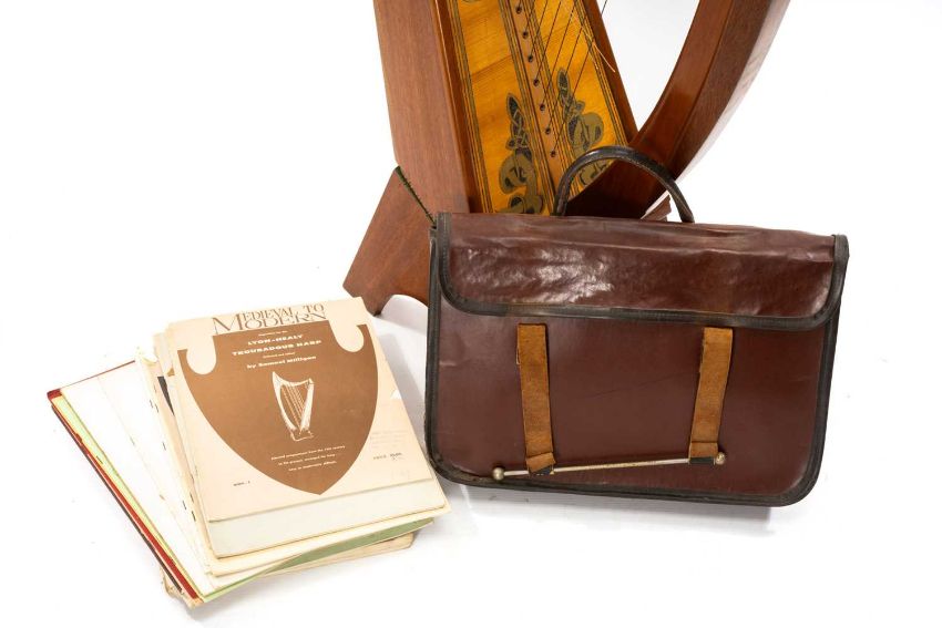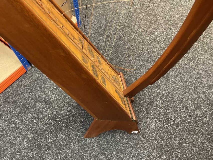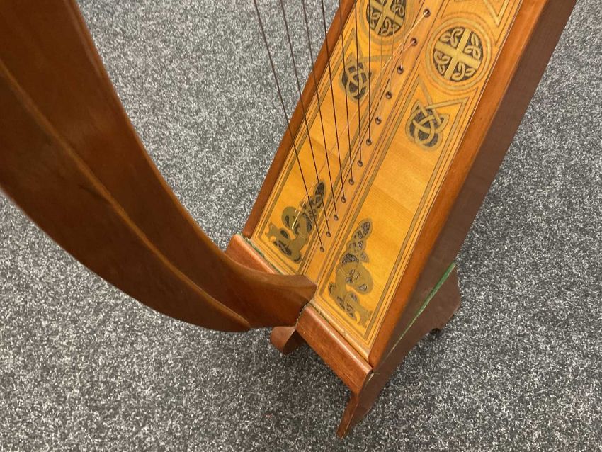 MUSIC CLUB HOUSE: WALTONS OF DUBLIN BRIAN BORU HARP, no. 656, 28 string dwarf harp modelled after the ancient harp at Trinity College, with incised gilt and scorched Celtic motifs to the soundboard, on stand, applied with silver plate engraved plaque, 103cms (h), with green cloth cover and selection of harp sheet musicProvenance: private collection Vale of Glamorgan