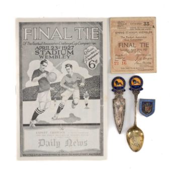 FOOTBALL CLUB HOUSE: 1927 CARDIFF CITY FINAL TIE TICKET, printed in black and red on claret decorated card, Entrance 33, Row 21 Seat 16, 8.5 x 7cms, with 1927 F.A. Cup winners commemorative enamel lapel badge, facsimile program, together with two electroplated and enamel 1924 British Empire Exhibition souvenirs (5)Provenance: private collection CardiffComments: enamel with chips, ticket small nick to one edge