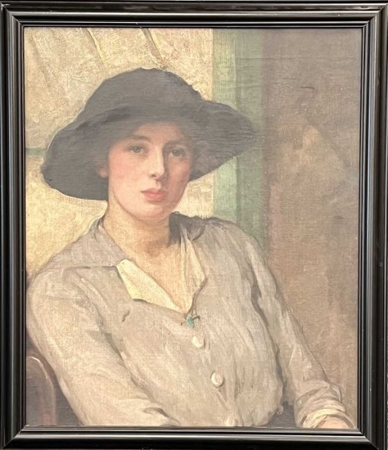 BRITISH SCHOOL oil on canvas - early 20th Century, well executed half length portrait of a seated lady, wearing a hat and a turquoise brooch, unsigned, 54.5cm x 45.5cm. comments: framedProvenance: private collection Gwynedd