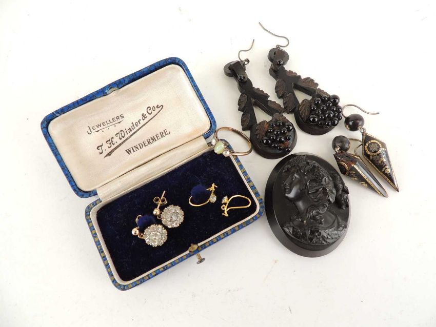 PAIR OF VICTORIAN PIQUE TORTOISESHELL PENDANT EARRINGS, also a pair of Victorian carved jet earrings, a Victorian jet brooch (a/f), and decorative paste earringsProvenance: private collection Cheshire