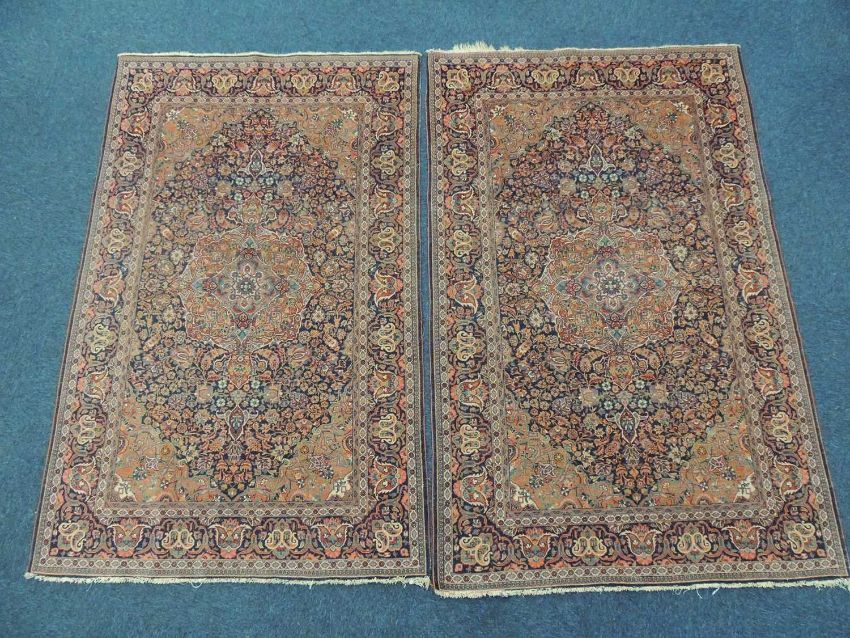 PAIR OF KASHAN WOOLLEN RUGS, c. 1900-20, having a deep blue field with central red and light blue medallion, 202 x 130cmsProvenance: private collection Cheshire