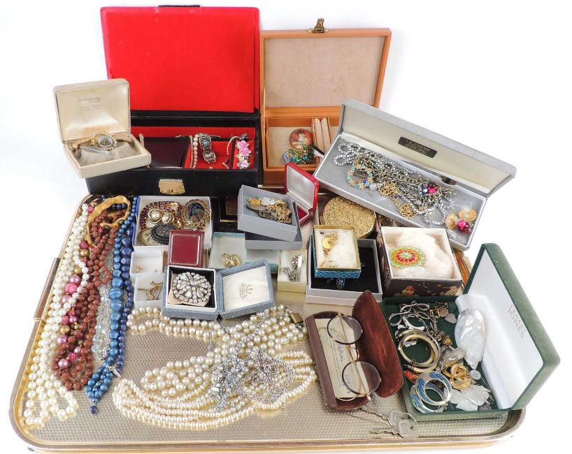 ASSORTMENT OF MIXED COSTUME JEWELLERY, including decorative paste, Victorian silver brooch with gold detailing, small amount of silver including enamelled Mexican earrings, two jewellery boxes with contents Provenance: private collection Cheshire