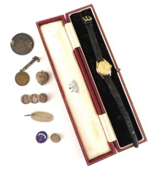 SMALL SELECTION OF COINS AND JEWELLERY including George III three shilling bank token, 1813, with brooch mounts, a coin brooch, silver heart shaped picture locket, silver cross pendant necklace, lady's Pulsar quartz wristwatch, boxed etcProvenance: private collection Cheshire