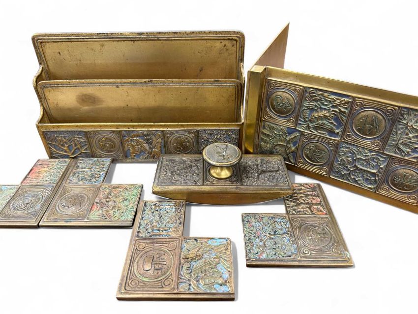 TIFFANY STUDIOS NEW YORK, 'BOOKMARK' GILT BRONZE DESK SET, comprising letter rack, 23cm x 13.5cm, blotter, four blotter corners and note pad cover, 19cm x 11.5cm, all stamped Tiffany Studios New York, numbered 1020, 1021 and 991 respectively (7)Provenance: private collection Powys