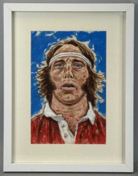 ‡ RAY THOMAS mixed media - head and shoulder portrait of JPR Williams, inscription verso, unsigned, 29 x 19cmsProvenance: private collection Conwy