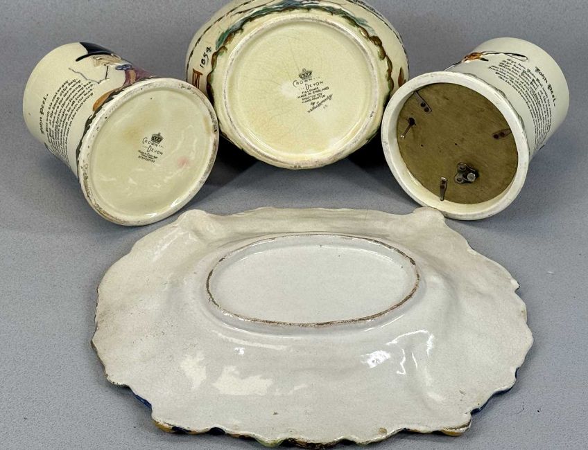 TWO CROWN DEVON MUSICAL JOHN PEEL TANKARDS, 11.5cms (h); John Peel decanter with fox design handle and stopper, 20cms (h); and Majolica oval dish, moulded with putti, 24 x 29cmsProvenance: private collection Gwynedd
