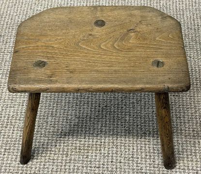 ANTIQUE WELSH ELM MILKING TOOL, shaped rectangular top, splayed turned supports, 30 (h) x 37 (w) x 25cms (d)Provenance: private collection Ynys Môn
