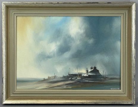 ‡ DAVID WESTON (British, 1935-2011) oil on canvas - coastal view with building, boats, and figures to side, signed and dated 1975 lower right, 24 x 34cmsProvenance: private collection GwyneddComments: framed