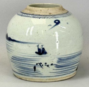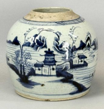 19TH CENTURY CHINESE UNDERGLAZE BLUE & WHITE GINGER JAR, painted with a landscape of mountains, trees, and buildings, 20cms (h)Provenance: private collection Conwy