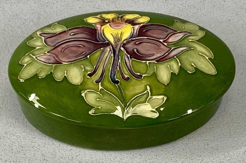 MOORCROFT OVAL COLUMBINE LIDDED BOX, 13 x 9cms; and a hibiscus lidded heart-shaped box, 7cms; posy vase, 9.5cms (h); and teardrop pendant, 10 x 8cmsProvenance: private collection Denbighshire