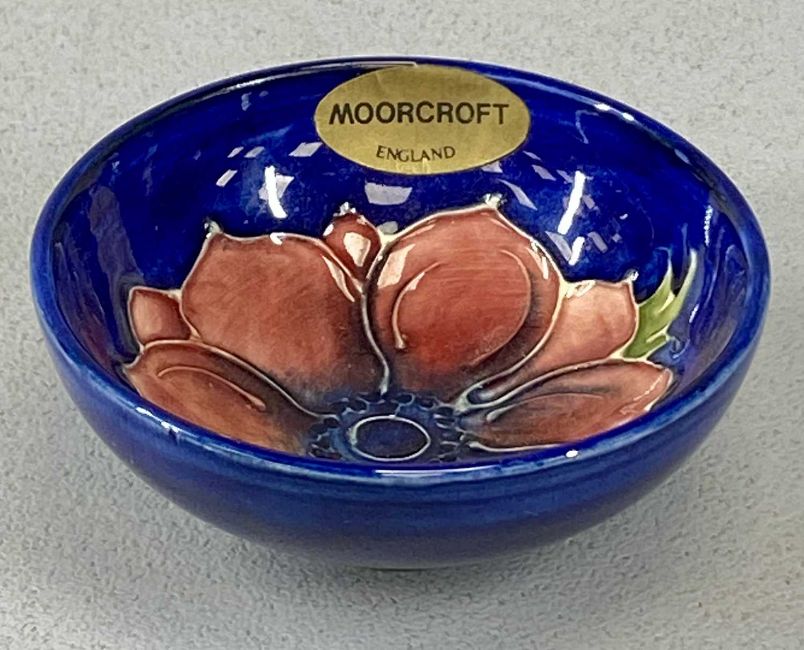 MOORCROFT ANEMONE CIRCULAR LIDDED BOWL, 12.5cms (diam.), and squat vase, 7.5cms (h); hibiscus circular lidded bowl, 7cms (diam.); and an anemone circular bowl with original paper label, 9.5cms (diam.)Provenance: private collection Denbighshire