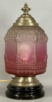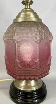 RETRO TABLE LAMP with black ceramic base and nickel fittings, blown and etched octagonal pink and clear shadeProvenance: private collection Ynys Môn