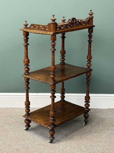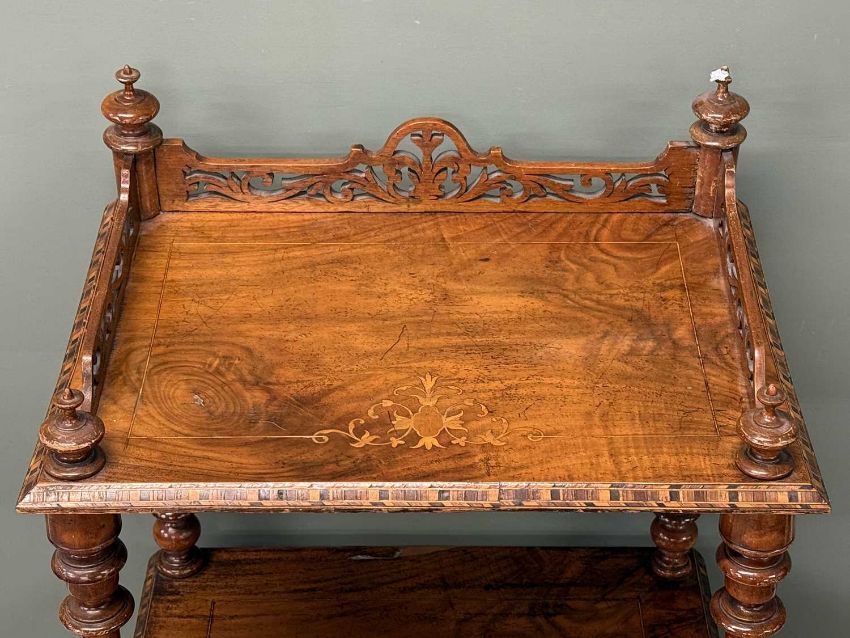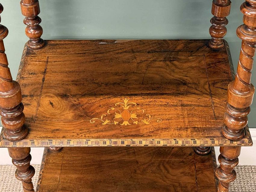 VICTORIAN INLAID WALNUT THREE-TIER WHATNOT, with fret pierced gallery, turned columns, 104 (h) x 52 (w) x 36cms (d)Provenance: private collection Ynys Môn