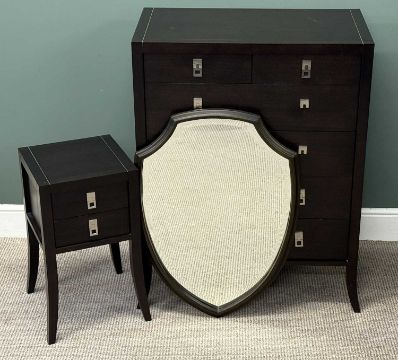 NEXT BEDROOM FURNISHINGS, comprising chest of two short and four long drawers, 108 (h) x 88 (w) x 45cms (d); matching bedside two-drawer chest, 64 (h) x 40 (w) x 36cms (d);Pine bedside chest of three drawers, 58 (h) x 44 (w) x 34cms (d); and a shield-shaped wall mirror, 85 x 59cms